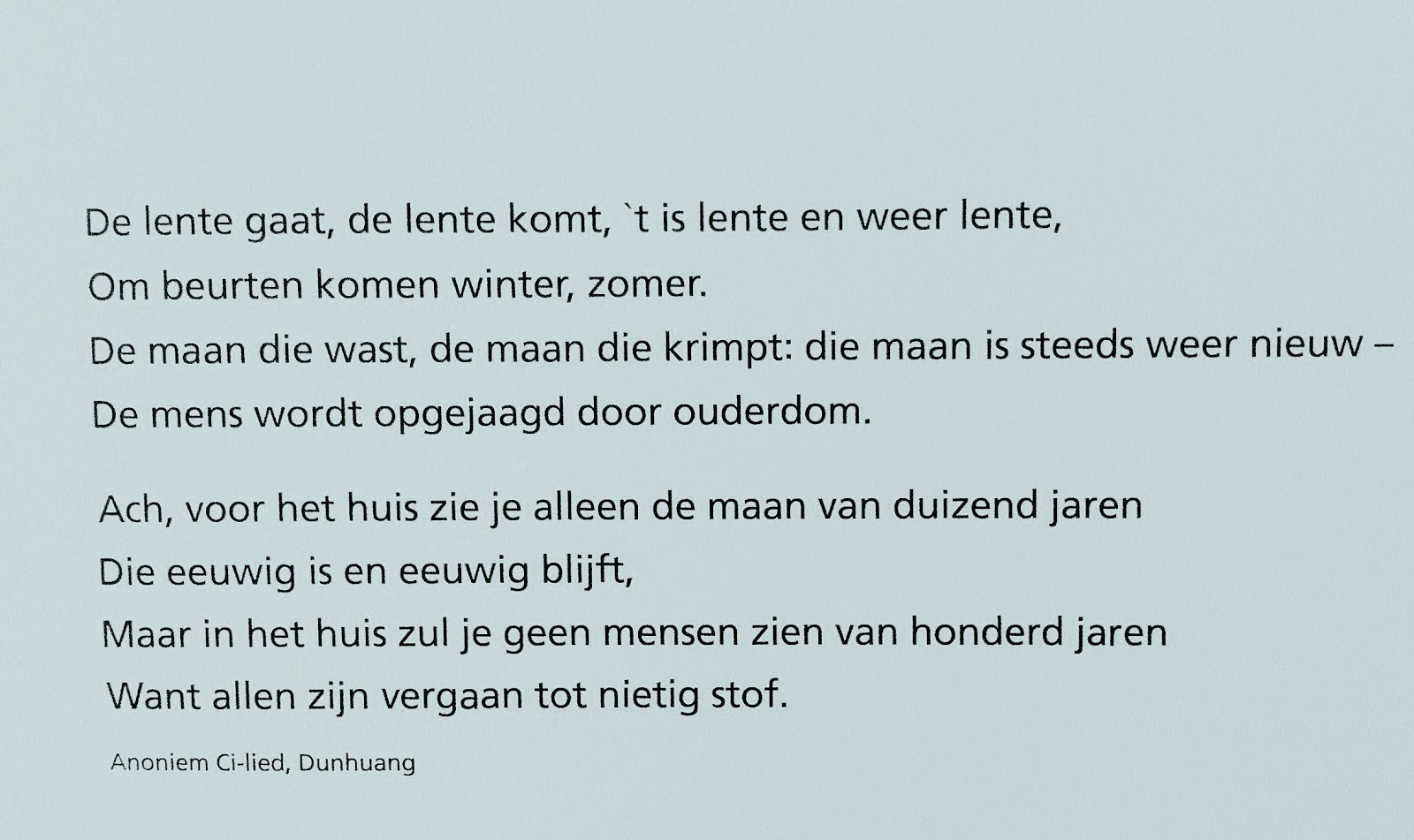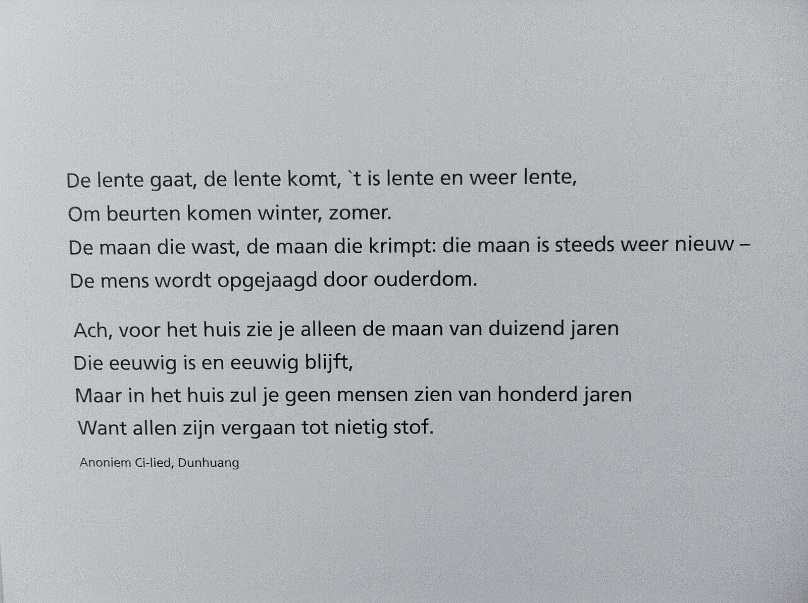 Tot half april 2012 loopt een prachtige tentoonstelling in het Drents Museum te Assen: Gouden Eeuw van China. Er zijn niet alleen fraaie, uit graven afkomstige, kunstobjecten te zien, maar ook gedichten uit de bloeiperiode van de Tangdynastie (618 – 907). Zoals dit melancholieke lentegedicht: