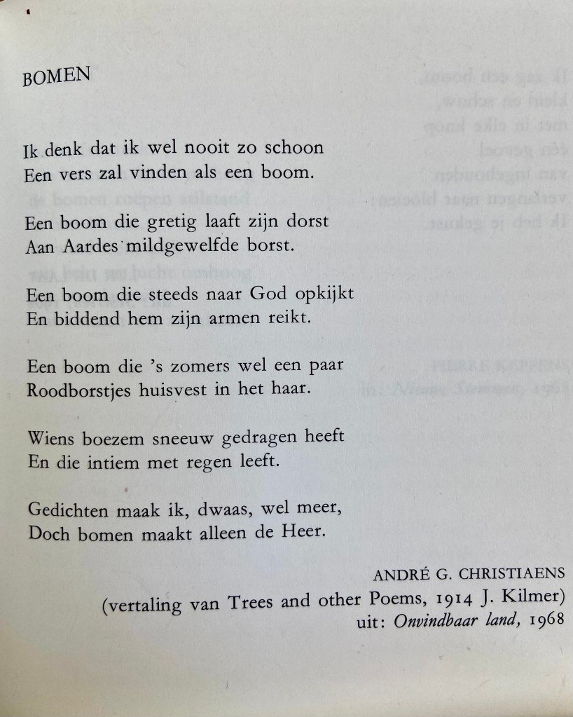 Ineen bundel met boomgedichten (Een boom voor elke dag, samenstellers E. de Laat en J. Uytterhoeven, Antwerpen 1980) trof ik onderstaande vertaling aan van het gedicht Trees van Joyce Kilmer. Lees en vergelijk!
