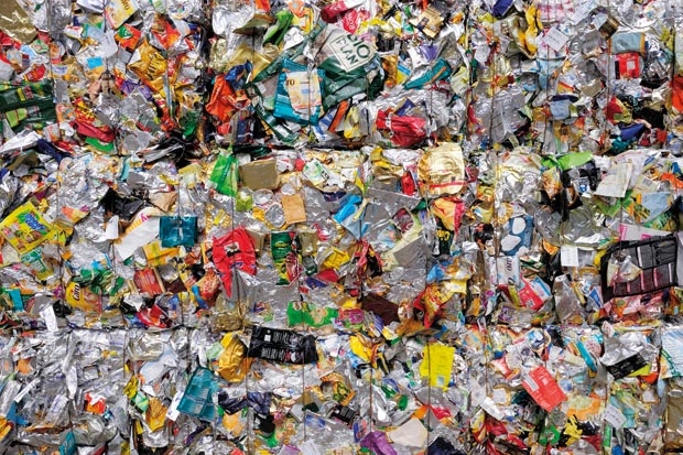 Dit lijkt op het eerste gezicht een abstract schilderij. Maar het is een foto van samengeperst plastic afval. Ik erger me vreselijk aan het naar mijn gevoel toenemend gebruik van plastic verpakkingsmateriaal, zeker sinds ik weet dat we daarmee onze oceanen en de voedselketen ernstig vervuilen en verzieken.