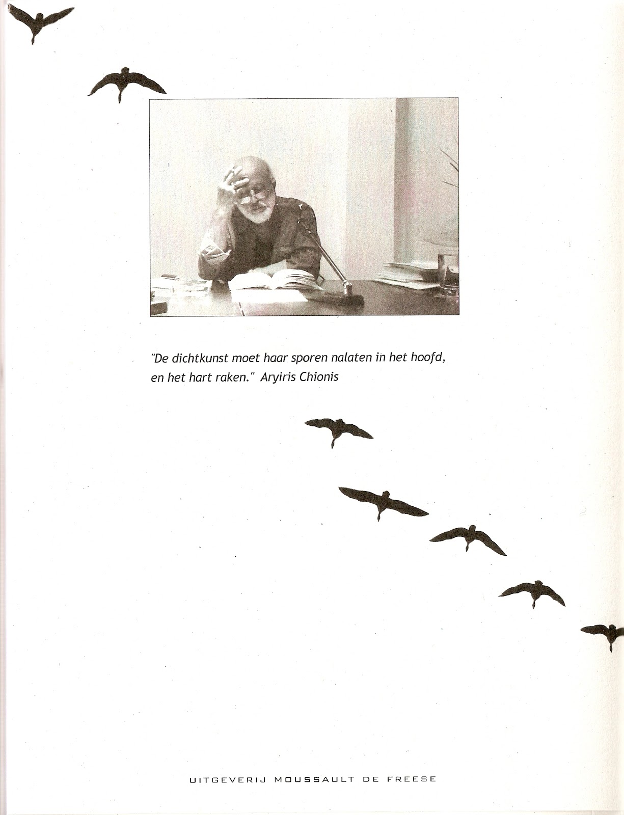 Chionis moest in 1967 vluchten voor het Griekse kolonelsregime en verbleef 10 jaar onder meer in Nederland. Hij keerde terug naar zijn moederland en publiceerde in totaal 12 dichtbundels. Deze bundel bevat ruim 60 korte en lange prozagedichten met een ongekende diepte en zeggingskracht. Er zijn invloeden te bespeuren van de dichtkunst uit het Verre Oosten, soms expliciet zoals in het eerste gedicht hierboven. Het schitterend bibliofiel uitgegeven boek wil ik warm aanbevelen bij elke ware poëzieliefhebber!