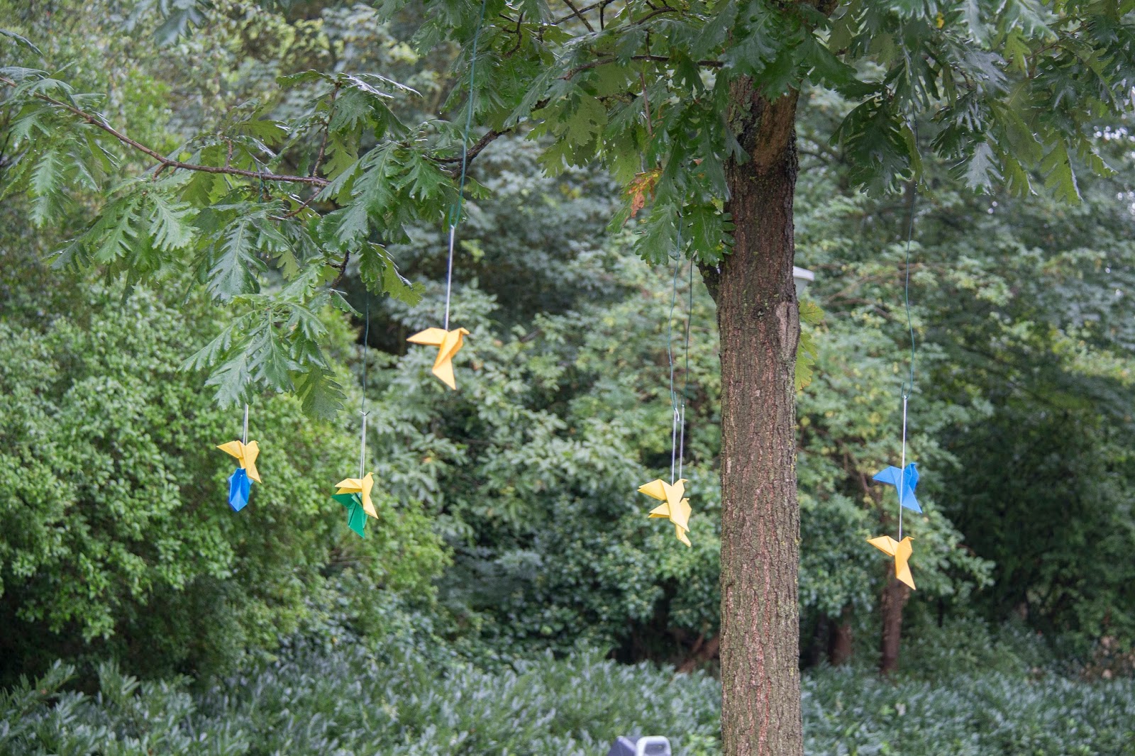 | Een van de 4 eiken met origami-duifjes (foto: Marijke Dusseljée) |