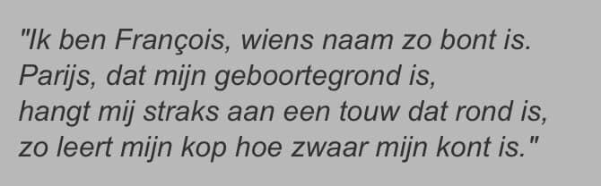 Het complete werk van Villon is in het Nederlands vertaald door Ernst van Altena. Zo ook het kwatrijn hieronder. De dichter schreef het in de gevangenis als grafschrift, in afwachting van zijn executie. Hij kreeg echter gratie en werd verbannen. Een lot dat hij deelde met de klassieke dichter Ovidius.