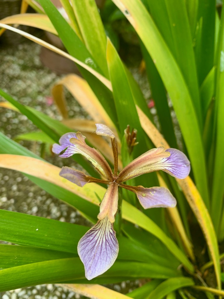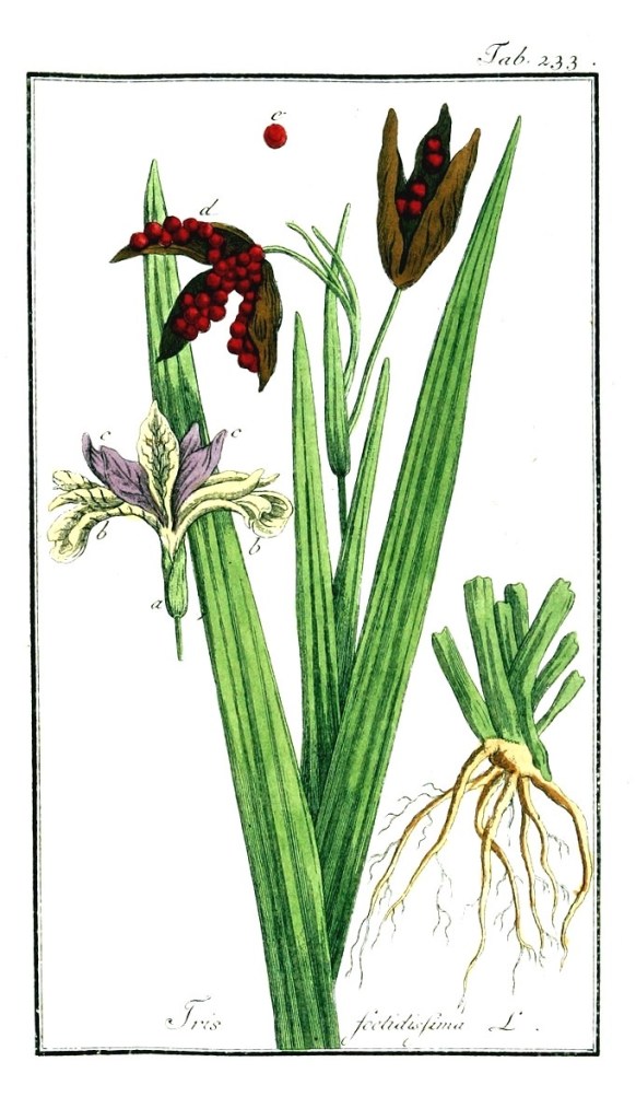 Vandaag zagen we ineens dat tussen de bladstengels een aantal lelie-achtige bloemen was opgekomen! Met behulp van Google leerden we dat het om de Stinkende lis, ofwel Iris foetidissima, moest gaan. De plant is inderdaad van Zuid-Europese afkomst en erg zeldzaam in Nederland.