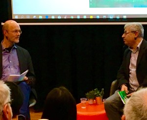 Links presentator Jaap Lemereis, rechts dichter Ali Şerik, tijdens de bundelpresentatie op 16 december.