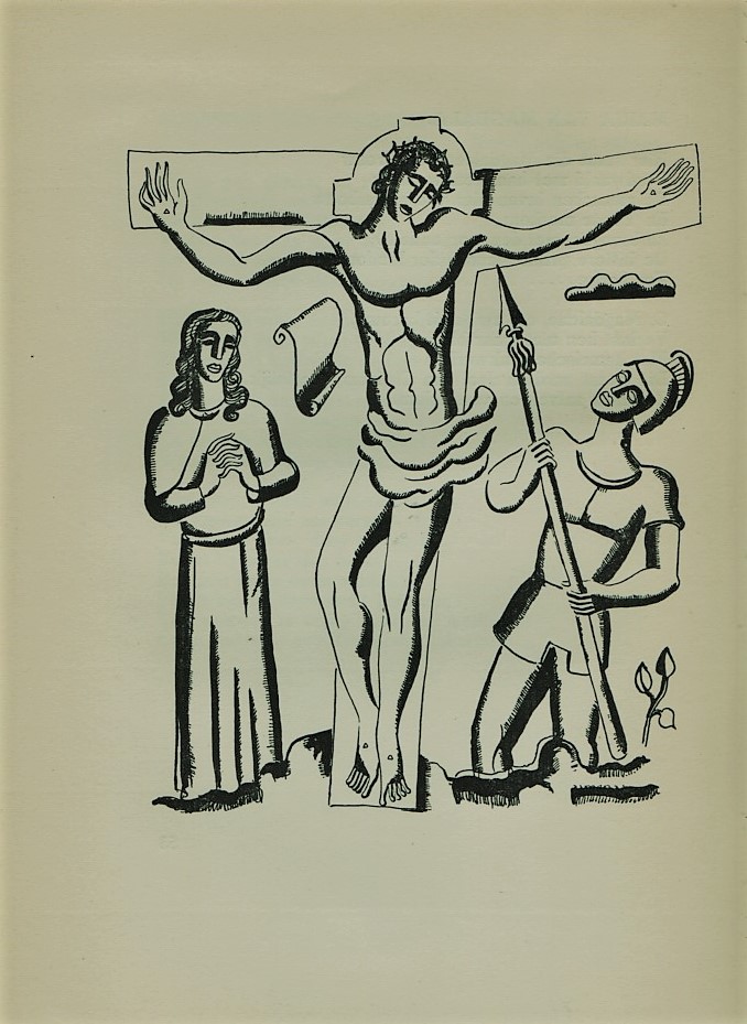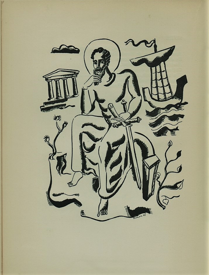 Ik heb de zes tekeningen van Lambert Simon (1909-1987) uit de bundel gescand en hieronder geplaatst. Ze dragen achtereenvolgens de titels: Crucifix, Piëta, Sint Jan, Sint Paulus, Sint Sebastianus en Sint Laurentius. De illustraties van Simon springen er voor mij uit om hun krachtige stijl; maar ook vanwege de esthetische uitbeelding van Christus en de apostelen en heiligen als jonge mannen in de bloei van hun leven. Opvallend zijn ook de picturale verwijzingen op vrijwel alle kunstwerken naar klassieke tempels uit de Griekse Oudheid. Misschien een verwijzing naar het geboorteland van de democratie in de donkere jaren dertig van de vorige eeuw? De Gemeenschap* was van 1925 tot 1941 het toonaangevende culturele tijdschrift van jonge en progressief denkende katholieke intellectuelen. Lambert Simon was (muur)schilder, tekenaar, beeldhouwer en glazenier en lid van het Utrechtse Genootschap Kunstliefde.