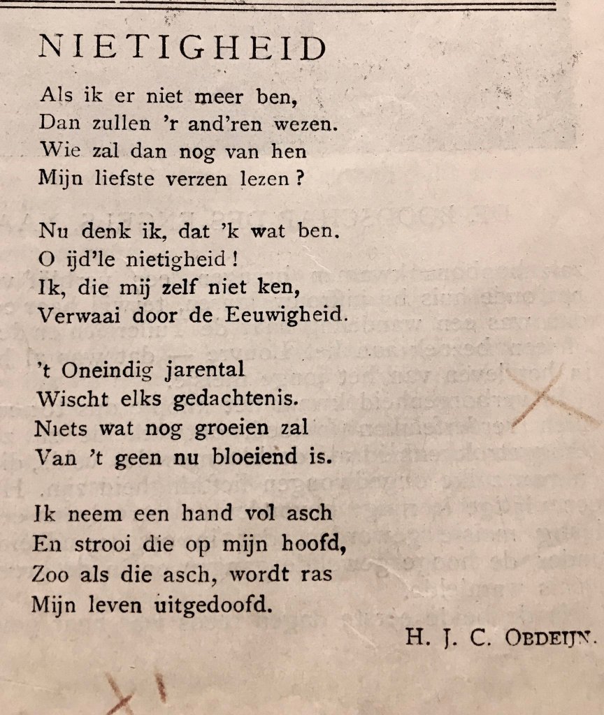 Dit typisch Memento mori gedicht trof ik aan in een uitgave van de Katholieke Illustratie uit 1909. Gelet op de kruisjes bij de tekst, werden in het grijze verleden meer lezers geraakt door de treffende inhoud. Treffend, maar ook wel somber. Om in Latijnse sferen te blijven, ik mis de conclusie: het leven is kort, dus Carpe Diem! Oftewel: Mensch, durf te leven!