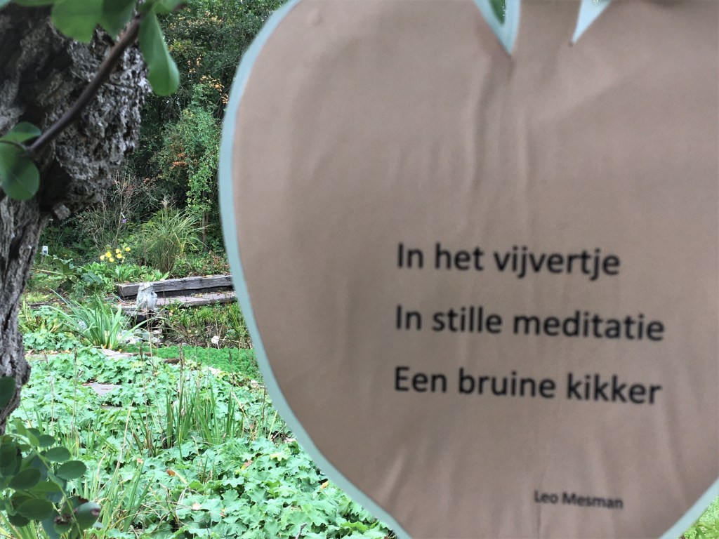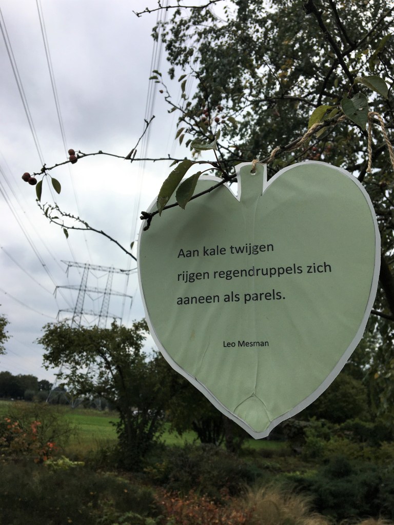 Zoals bij Catharina de landschappen uit haar jeugd in De Bilt en omgeving (bijvoorbeeld Landgoed Beerschoten en het Panbos in de nieuwe bundel) een belangrijk thema vormen in haar poëzie, zo is voor mij het ‘groene paradijs’ van mijn kinderjaren in Nuenen een inspiratiebron in diverse gedichten (Retour Nuenen 2018). In de loop van de jaren hebben we elkaar over en weer betrokken bij poëtische evenementen en publicaties in onze eigen omgeving. Een hoogtepunt in onze vriendschapsband vond ik ons gezamenlijk optreden op Open Monumentendag in september 2013 in Villa Bloemenheuvel in Zeist. Het doet mij deugd dat zowel haar als mijn gedichten van die dag nu een eigen plek hebben gekregen in dit Gedichtenblog .