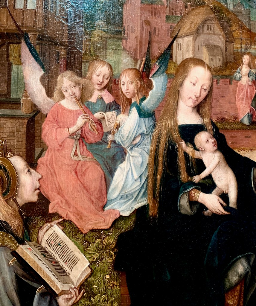 Op de (nog lopende) tentoonstelling ‘In de ban van de Middeleeuwen’ in het Utrechtse museum Catharijneconvent werd ik getroffen door deze ontroerende uitbeelding van het kerstverhaal. De grappige koppies van de musicerende engelen, de serene eenvoud van Maria in haar donkerblauwe fluwelen kleed, het blote kindje Jezus dat zich – wegkijkend – vastklampt aan het lange haar van zijn moeder, de mooie zachte kleuren waarin het hele tafereel is geschilderd. En er is nergens sneeuw te bespeuren! Wel lentebloempjes. In de linkerhoek staat de vermoedelijke adellijke schenkster van het religieuze kunstwerk. En rechtsboven de voedster van de nieuwgeborene.